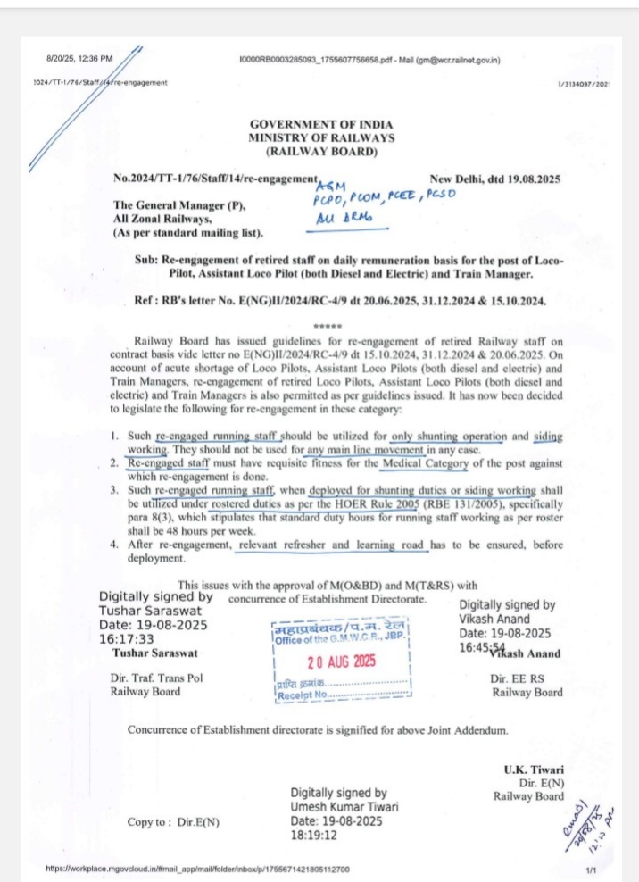 Loco running staff, under the banner of All India Loco Running Staff Association (AILRSA), are criticizing the Railway Board’s policy of re-engaging retired workers. The Railway Board’s letter dated 19 August (attached below) acknowledge the “acute shortage of Loco Pilots, Assistant Loco Pilots (both diesel and electric) and Train Managers.” Instead of filling the nearly 29,000 vacancies in Loco Pilot and Assistant Loco Pilot categories with fresh recruits, the government is trying to take a shortcut by re-employing retired workers on per-day wages! There have been deliberate, prolonged delays in recruitment, which has led to extreme burden on existing workers. In some cases, Loco Pilots have been made to work for more than 14 hours—and in one case, even 25 hours—at a stretch. Over the years, workers have organized several agitations and protests to demand recruitment. At the same time, various committees, government authorities and High Court judgments have recommended immediate recruitment. The Railway Board’s shortcut of re-employing retired workers is an anti-worker and anti-youth step that affects the safety of both workers and passengers.