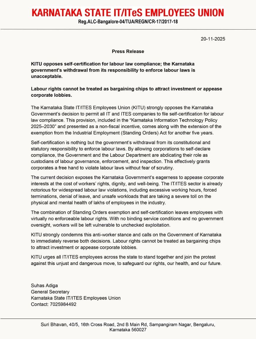 Karnataka State IT/ITeS Employees Union (KITU) Press Release