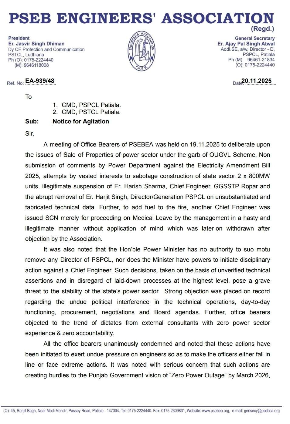 Letter by PSEB Engineers’ Association to Chairman of Punjab State Power Corporation and to Punjab State Transmission Corporation