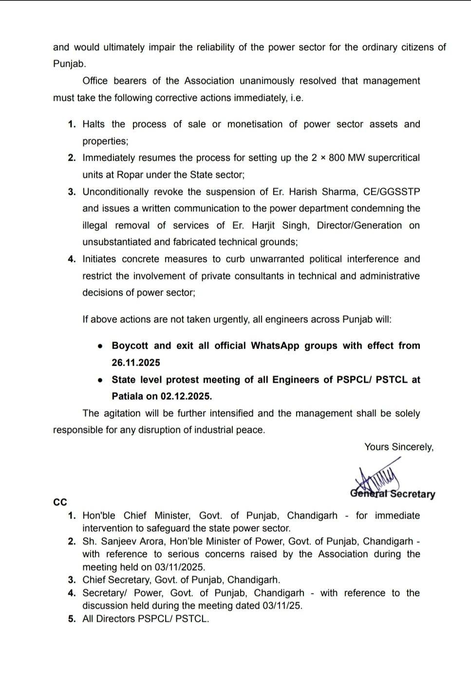 Punjab State Electricity Board engineers demand halt to sale or monetisation of power sector assets and properties and implementation of their other demands