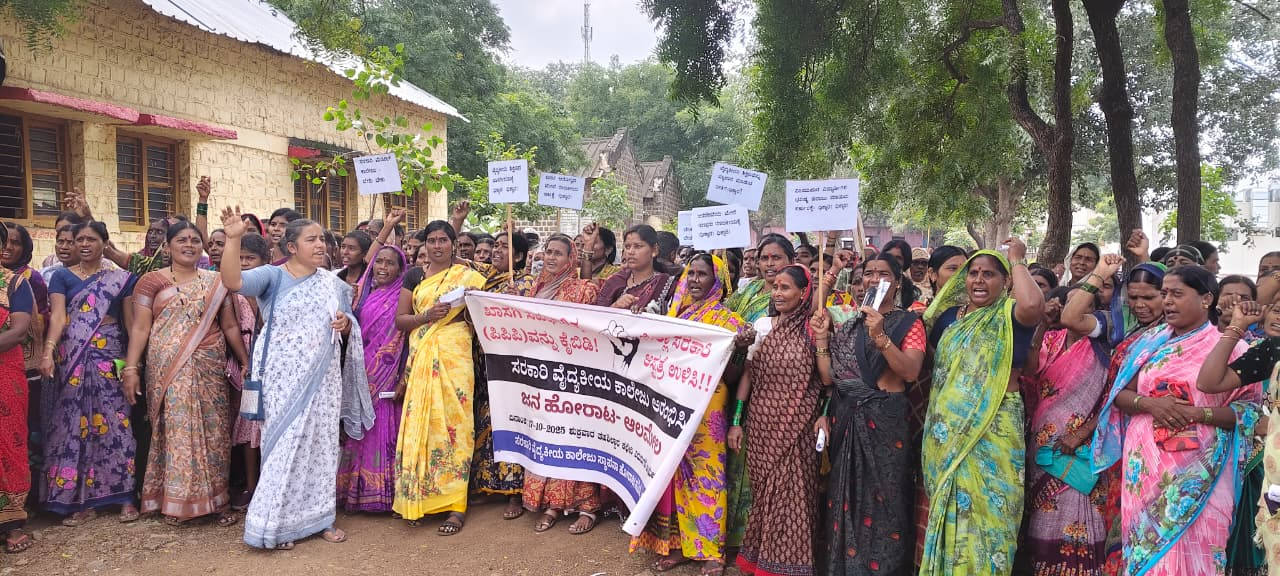Despite the overwhelming power of state-backed private healthcare actors, resistance is increasing across Karnataka. Communities, unions, doctors and public health advocates are challenging privatisation through multiple methods and protesting. Women are participating in the protests actively and in large numbers. Across districts, health workers’ unions have opposed outsourcing of diagnostics and labs, arguing that contract systems exploit workers while degrading care quality. Activists have also organised around issues like land misuse, denial of emergency care, refusal to treat poor patients, and inflated billing.