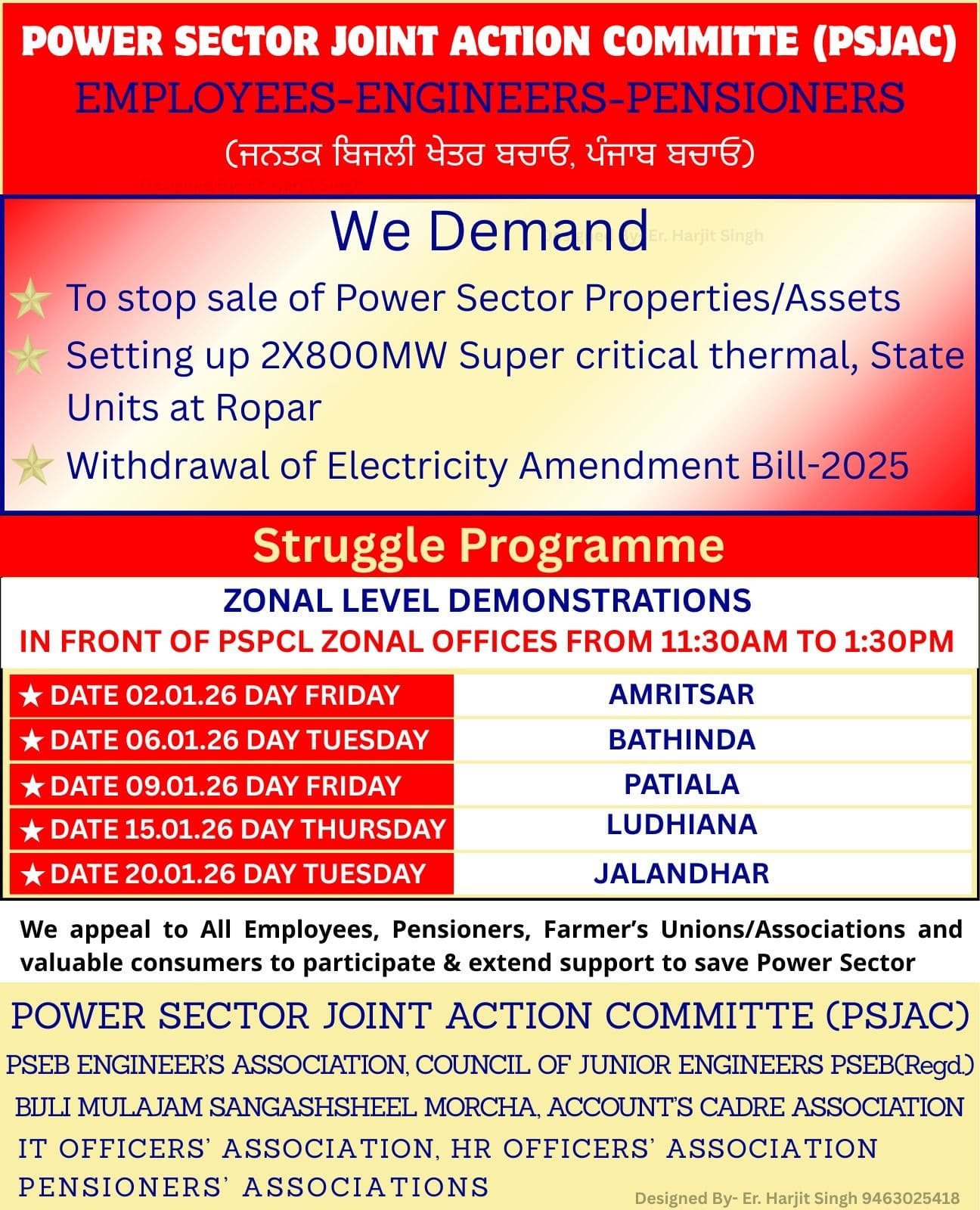 On the call of the Power Sector Joint Action Committee, Punjab engineers, employees, officers, pensioners’ organizations joined the fifth zonal-level protest in front of the office of the Chief Engineer, North Jalandhar, on 20 January 2026. They were opposing the sale of the assets of the Power Department and the Electricity Bill 2025. They demanded the establishment of two thermal units of 800 MW in Ropar. Previously, big protests were held in Amritsar on 2 January, Bathinda on 6 January, Patiala on 9 January, and Ludhiana on 15 January.