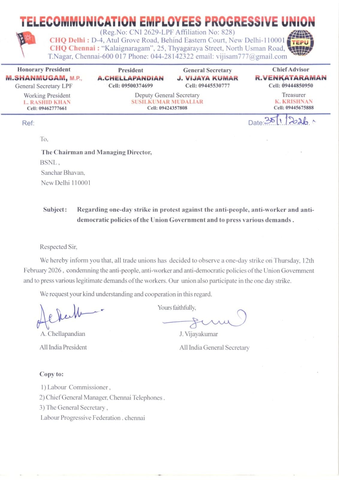Telecom employees to join the All India Strike on 12 Feb to protest against the anti-people, anti-worker policies of the government and to press various demands