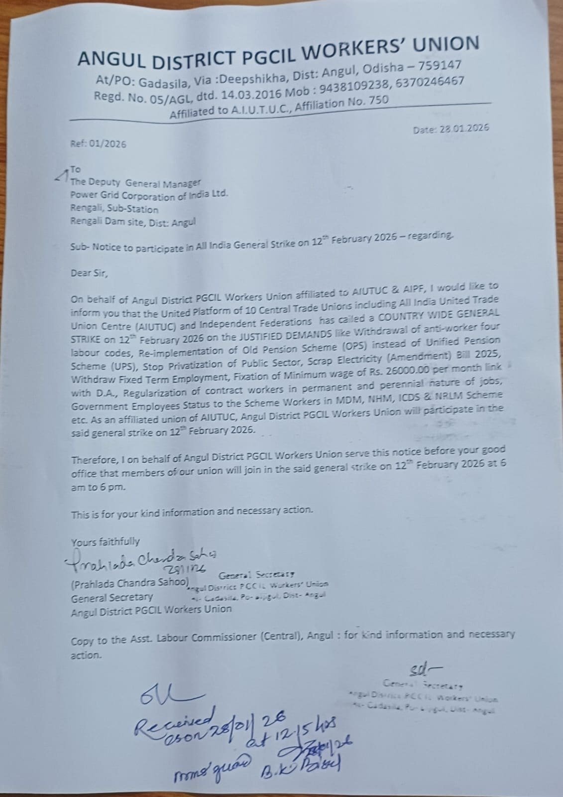 Strike Notice by Angul District PGCIL Workers’ Union