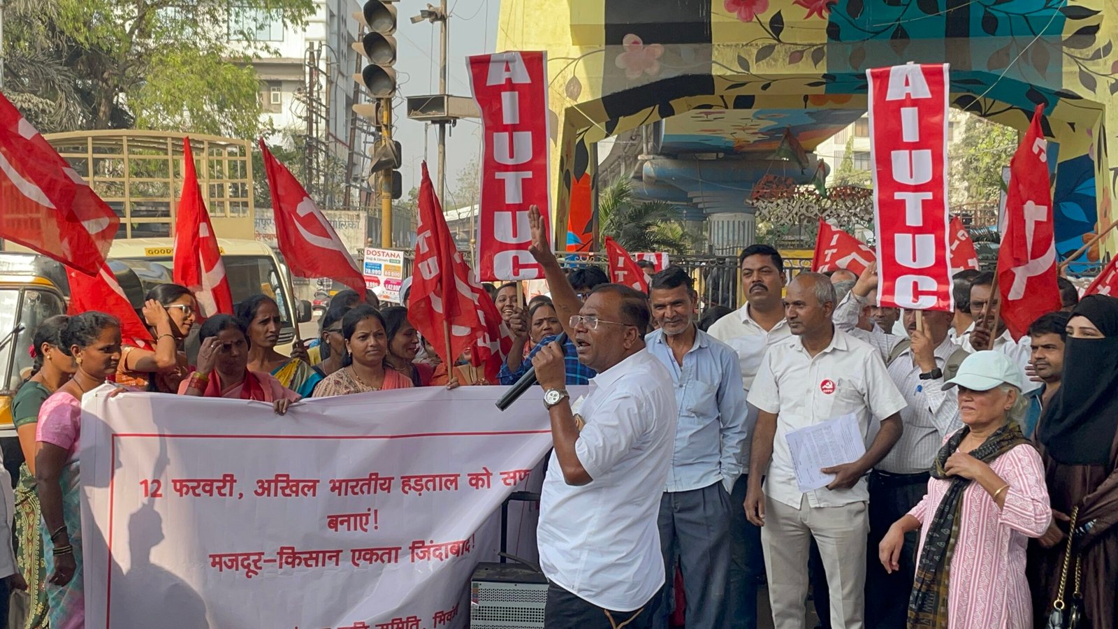 The demonstration of 12 February was organized by Kamgar Sanghatana Sanyukt Kriti Samiti consisting of CITU, AIUTUC, Kamgar Ekta Committee, and other organizations. The demonstration was addressed by Comrade Dr. Das and Smt. Trupti from Kamgar Ekta Committee (KEC), Comrade Sunil Chavan from Centre of Indian Trade Unions (CITU), Comrade Tyagi from All India United Trade Union Centre (AIUTUC) and Smt. Kamala Gattu, a union leader of beedi workers.
