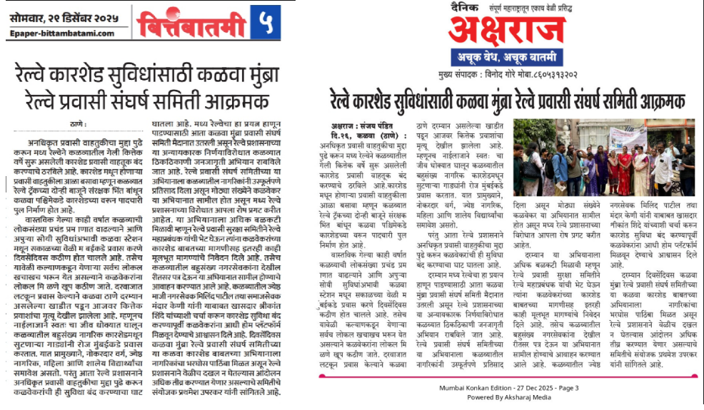 By Prathamesh, Convenor, Kalwa-Mumbra Railway Pravasi Suraksha Sangharsh Samiti