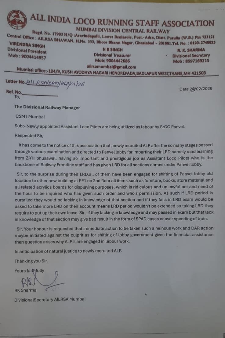 The All India Loco Running Staff Association (AILRSA) Mumbai Division has written to the Divisional Railway Manager pointing out the misuse of the trained loco pilots and asked it to be stopped. (Letter enclosed)