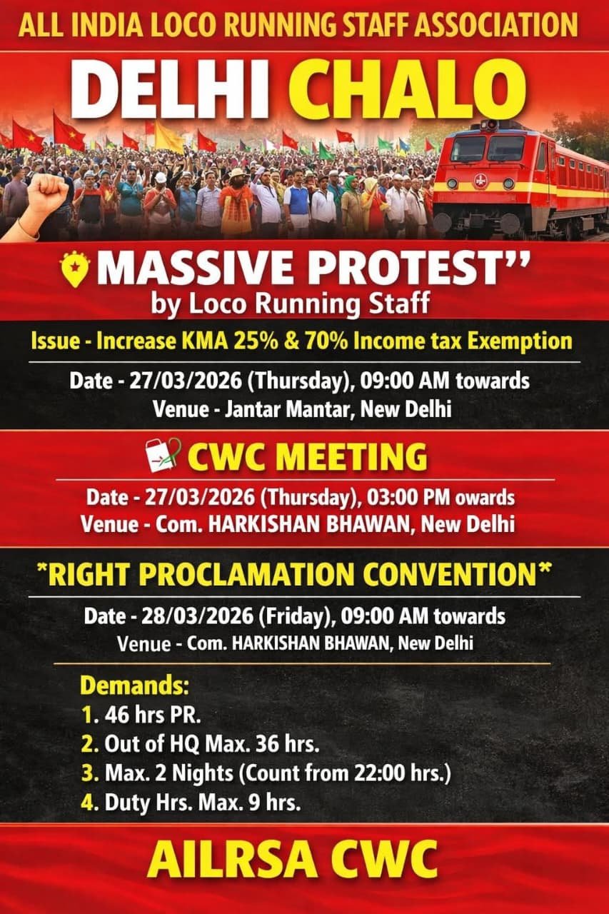 Massive Protest has been organised by All India Loco Running Staff Association on March 27th and 28th, 2026 in Delhi